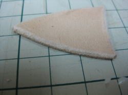 6. ヘビ革を扇型に写した線に合わせ接着します。先に貼った革が浮き出るよう先の丸い物で押さえます。