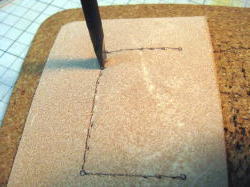 | 11. 【カード入れベースB】を【仕切り】に連結する為の縫い穴をあけます。 型紙の4つの穴をマークし縫い線を引き、縫い穴をあけます。作業は床面より行います。 |